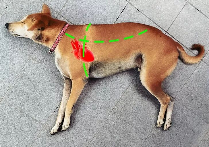 对于较大的狗:位置在狗胸腔最宽的部分(靠近心脏)进行,但不能直接在心脏上进行。