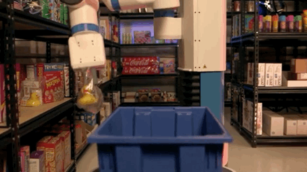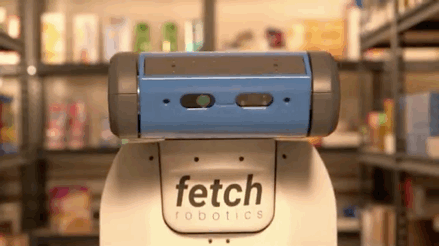 比如,在 Fetch 的仓储机器人“大家庭”里,有一个机械臂的 Fetch 机器人可以利用机器视觉、图像处理和导航等技术,按照订单内容,把商品从货架上拿下来,放入另一款载货搬运机器人上。