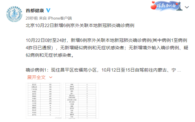 据首都健康微博消息,10月22日0时至24时,新增6例京外关联本地新冠肺炎确诊病例(其中病例1至病例4昨日已通报),无新增疑似病例和无症状感染者;无新增境外输入确诊病例、疑似病例和无症状感染者。