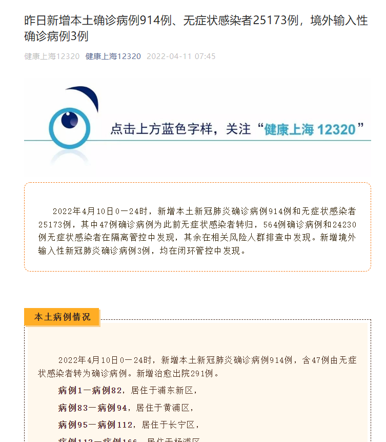 2022年4月10日0—24时,上海新增本土新冠肺炎确诊病例914例和无症状感染者25173例,其中47例确诊病例为此前无症状感染者转归,564例确诊病例和24230例无症状感染者在隔离管控中发现,其余在相关风险人群排查中发现。新增境外输入性新冠肺炎确诊病例3例,均在闭环管控中发现。